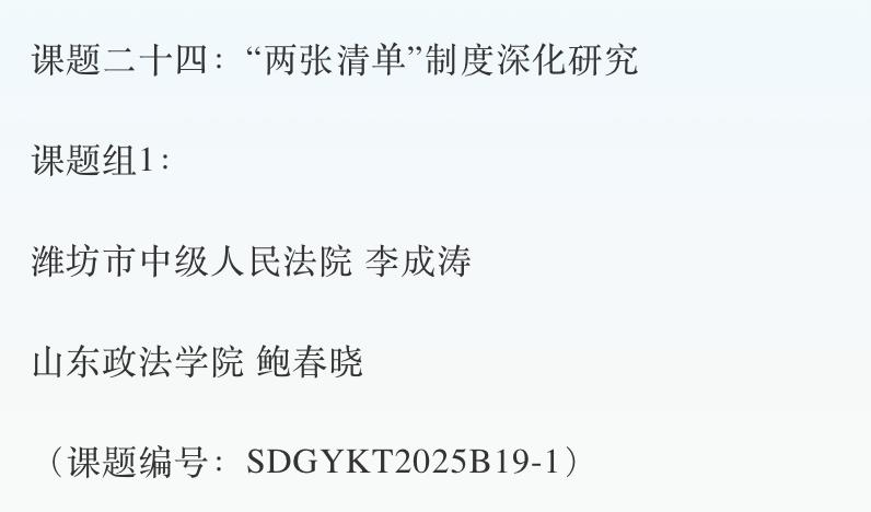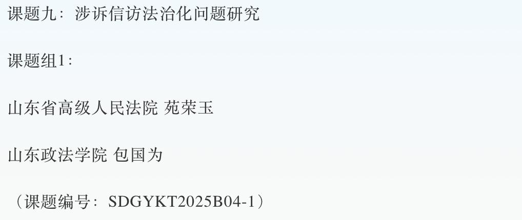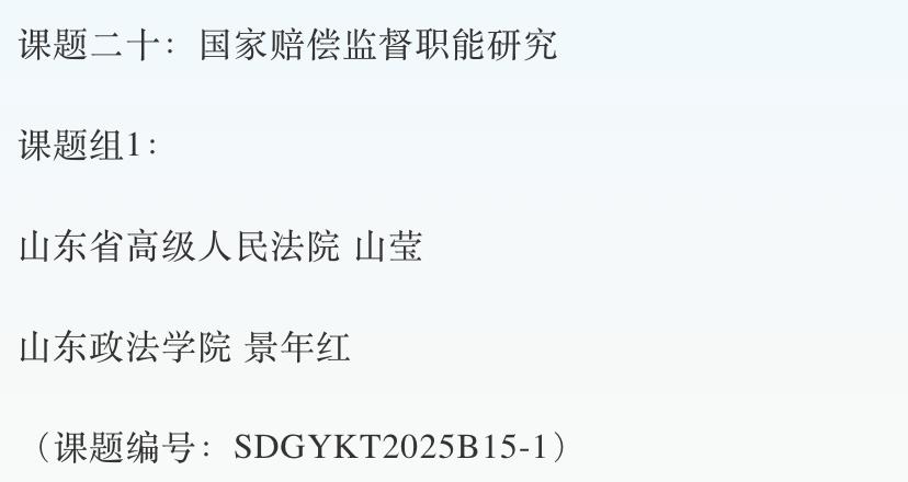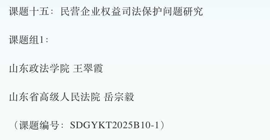 近日,山东省高级人民法院公布2025年度重点调研课题立项名单,刑事司法学院包国为副教授主持的《涉诉信访法治化问题研究》、王翠霞副教授主持的《民营企业权益司法保护问题研究》、景年红副教授主持的《国家赔偿监督职能研究》、教师鲍春晓主持的《“两张清单”制度深化研究》获立项。