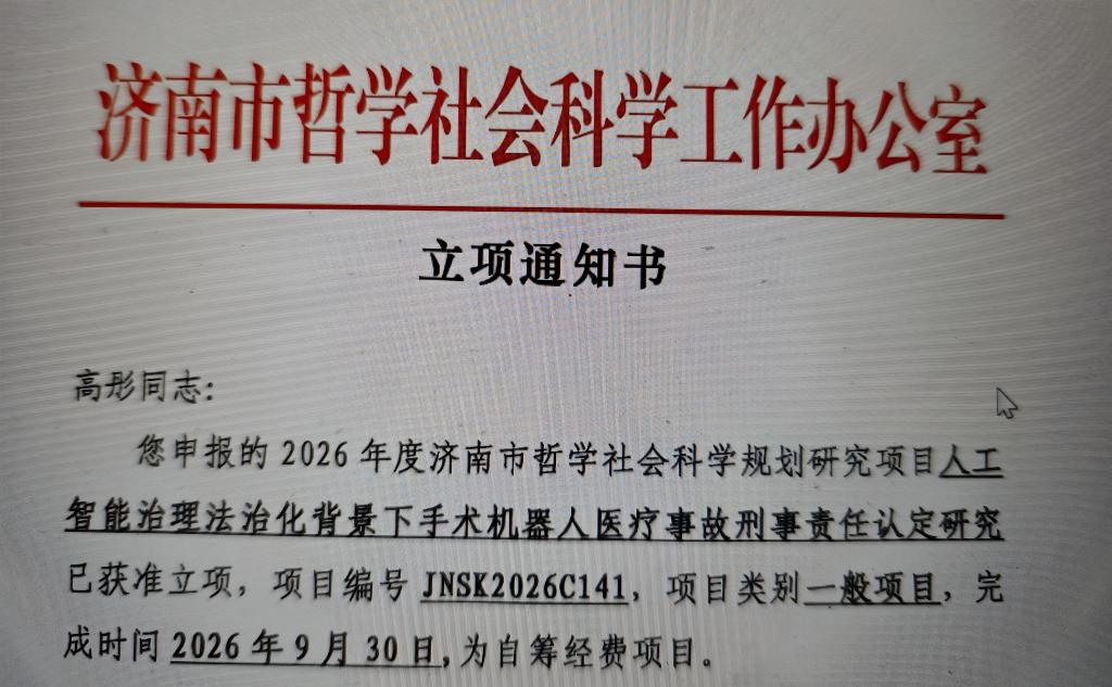 年度济南市哲学社会科学规划研究项目立项名单,刑事司法学院教师高彤主持的《人工智能治理法治化背景下手术机器人医疗事故刑事责任认定研究》获立一般项目。
