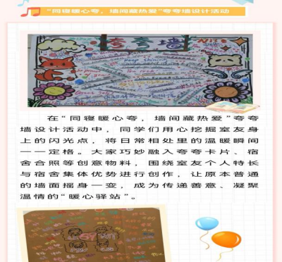 二是开展“共燃青春火,宿造美好时光”宿舍文化月系列活动。恰逢学校70周年华诞,学院特别策划“逐梦踏歌七十载,以声为礼贺校庆”祝福语录制活动,厚植学子爱校荣校情怀。在“同寝暖心夸,墙间藏热爱”夸夸墙设计活动中,同学们深入挖掘室友闪光点,通过夸夸卡片、宿舍合照等创意物料,展现室友个人特长与宿舍集体优势,让普通墙面成为传递善意、凝聚温情的“暖心驿站”。“一室守安,同心情深”宿舍安全文化趣味竞赛,创新融合安全知识答题与宿舍文化你画我猜环节,既强化了学生的安全意识,又增强了宿舍集体的向心力与凝聚力,充分彰显学院扎实的育人实效。