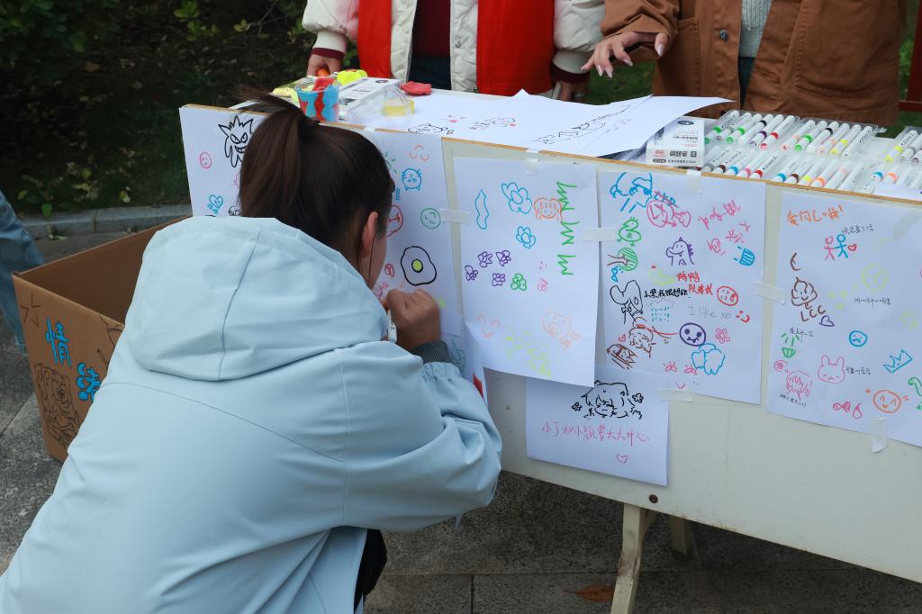 “共绘笑脸墙,传递心温暖”现场热闹非凡,同学们自由挑选彩笔与绘制区域,勾勒出一张张鲜活的笑脸,旁附心情关键词或暖心祝福。大家围在墙边交流绘画心得、欣赏彼此作品,纸上的真挚祝福与现场的欢声笑语,共同构成了民法典广场上最动人的风景。