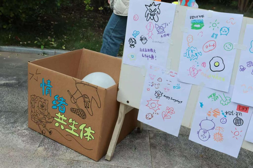 在“情绪共生体创作”中,同学们将心底的情绪具象为独特的“共生体”,赋予其专属的形状、色彩与故事。大家在A4纸正面用彩笔绘制命名,背面匿名写下情绪感悟或相关故事,完成后自愿分享、传递作品,在共鸣中拉近了心与心的距离。