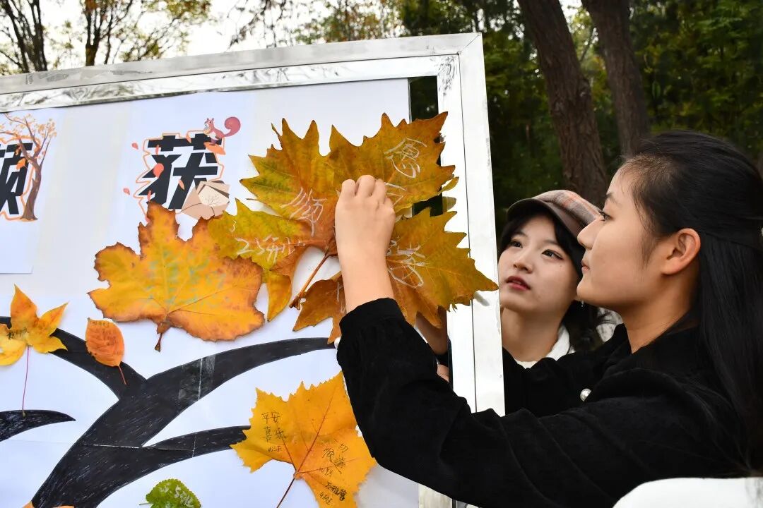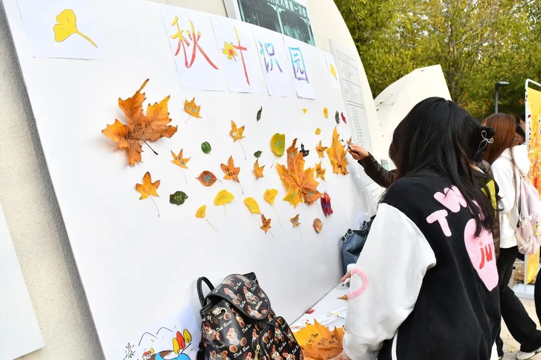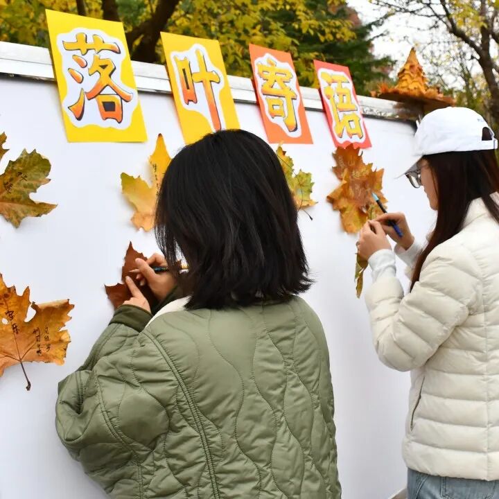 走进校园秋景,同学们细心收集形态各异的叶片,以叶为纸写下心底的期许与祝福,逐一张贴在“明法秋屏”之上。