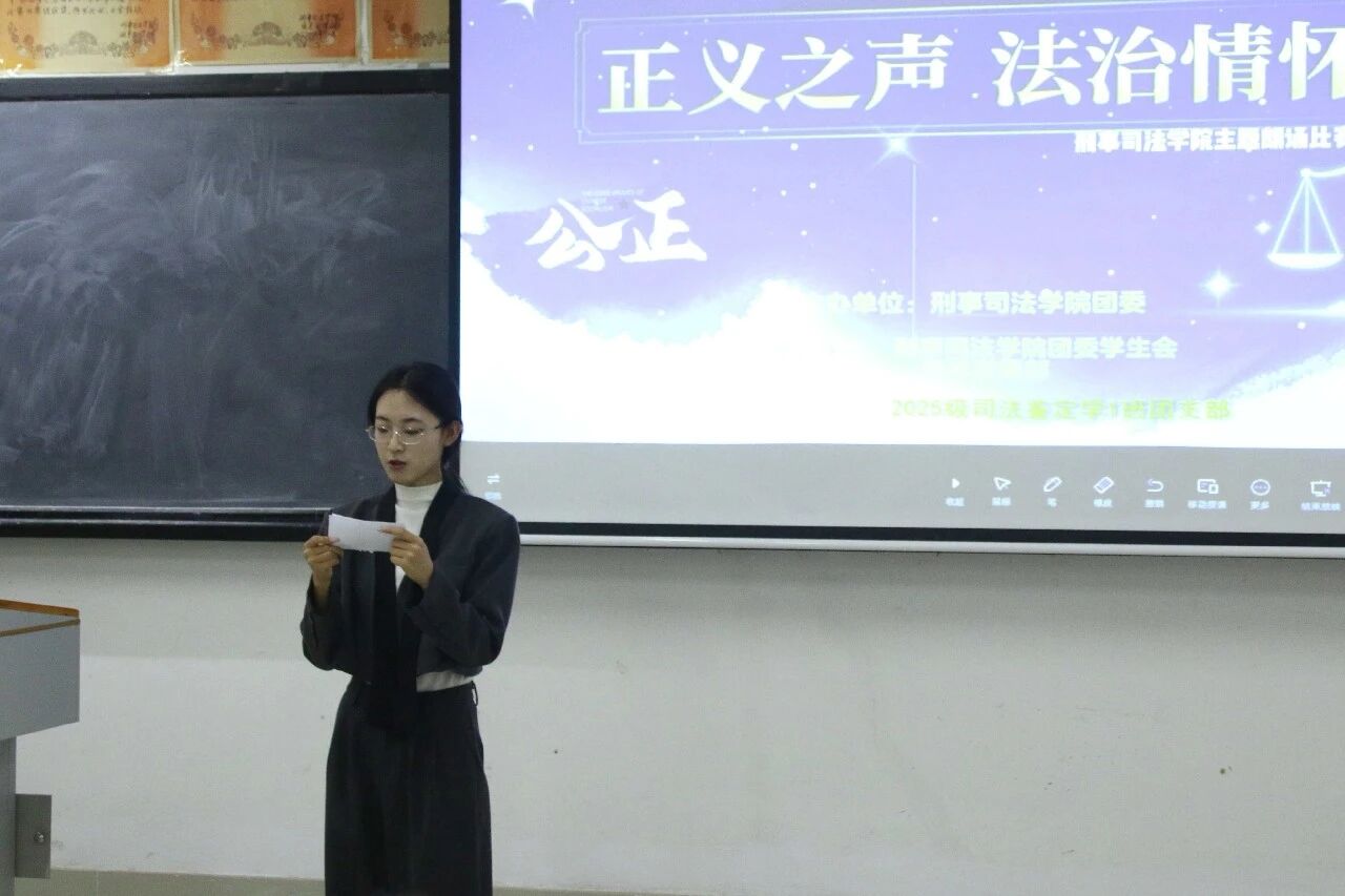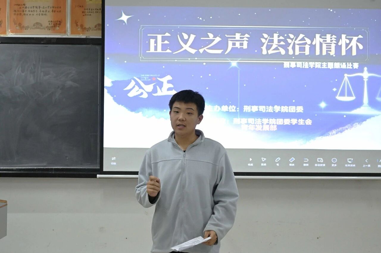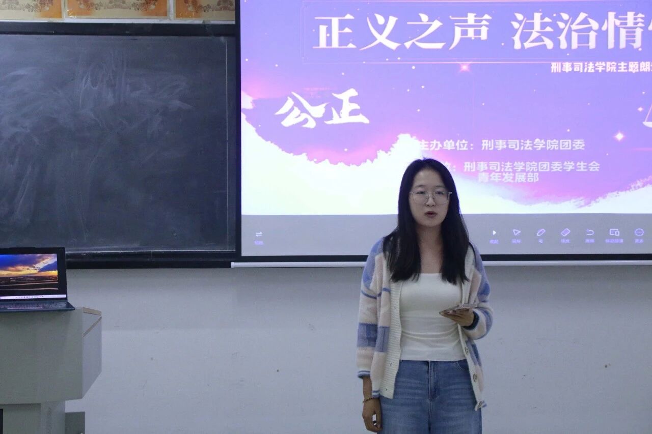 为厚植法治信仰、勇担时代使命,凝聚青年学子奋进力量,11月6日,刑事司法学院“正义之声,法治情怀”主题朗诵比赛在知行楼406教室举办。