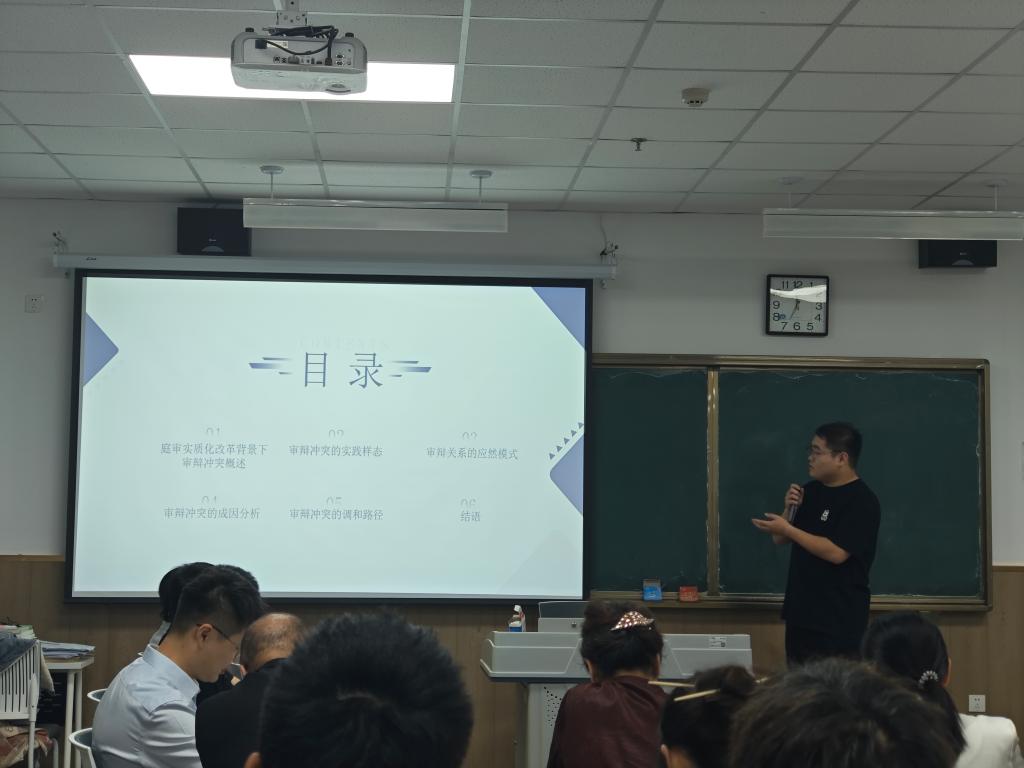 主讲环节,侯冠华同学立足于党的十八届四中全会中所提出的以审判为中心的诉讼制度改革的要求,提出庭审实质化改革是以审判为中心的诉讼制度改革的突破口和落脚点,通过分析目前庭审实质化背景下所产生的审辩冲突问题,寻找冲突成因,提出缓和路径。提问环节,与会同学积极参与互动,发表自己的观点。